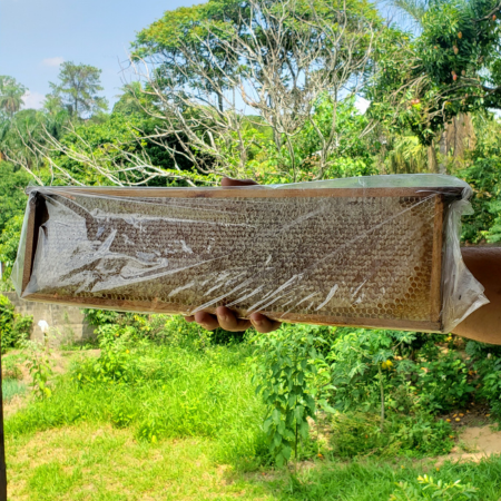 Produzido pelas abelhas no quadro de madeira.