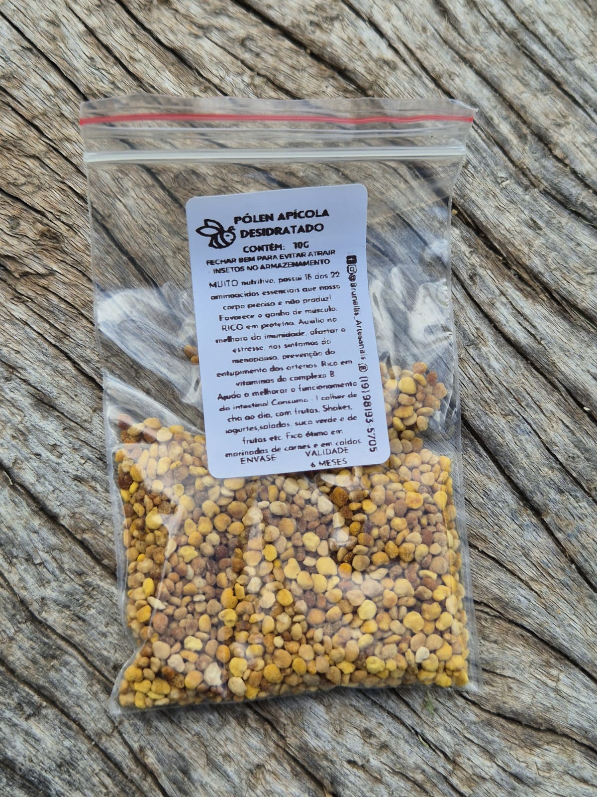 O Pólen é natural, produzido pelas abelhas. As abelhas usam o pólen como fonte de alimento, para alimentar as crias que irão nascer na colmeia e também para produção de geleia real. COMO É COLETADO: As abelhas, ao visitarem as mais diversas flores disponíveis na natureza, armazenam em suas corbículas, nas patas traseiras, onde aglomeram e se formam os grãos de pólen. Esse pólen é colhido por nós através de um equipamento instalado na entrada da colmeias. Importante dizer que só é recolhido uma parte e só o que seria excesso, garantindo assim que parte desse pólen colhido por elas sempre fique disponível para alimentação necessária. Cada flor tem um tipo de pólen, o que justifica a grande variedade de cor e sabor identificado em nosso paladar, podendo variar de amargo, doce, um pouquinho mais cítrico etc. . Nosso pólen é coletado de regiões de matas nativas e de palmáceas (palmeiras de coco por exemplo).
